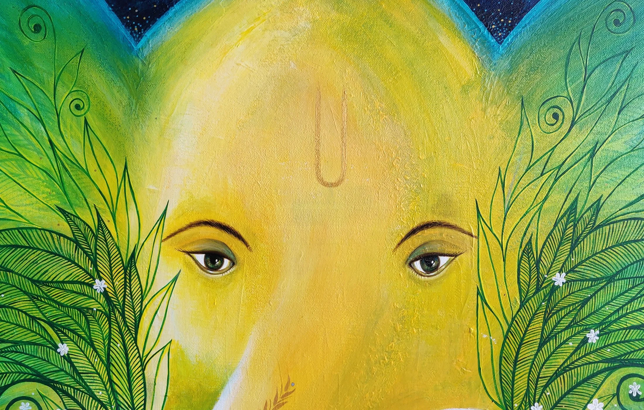 Usually I sketch before starting a new painting. But it was a different story for this one. I was totally blank. I didn’t have any thoughts or color palette in mind and somehow I was not willing to do any sketches and scribbles. I had drawn some shapes with a pencil on canvas. But once I held the brush with Yellow color, thoughts started to flow in mind. I had this spiritual energy within me, telling me to paint my most favorite god ‘Ganesha’.