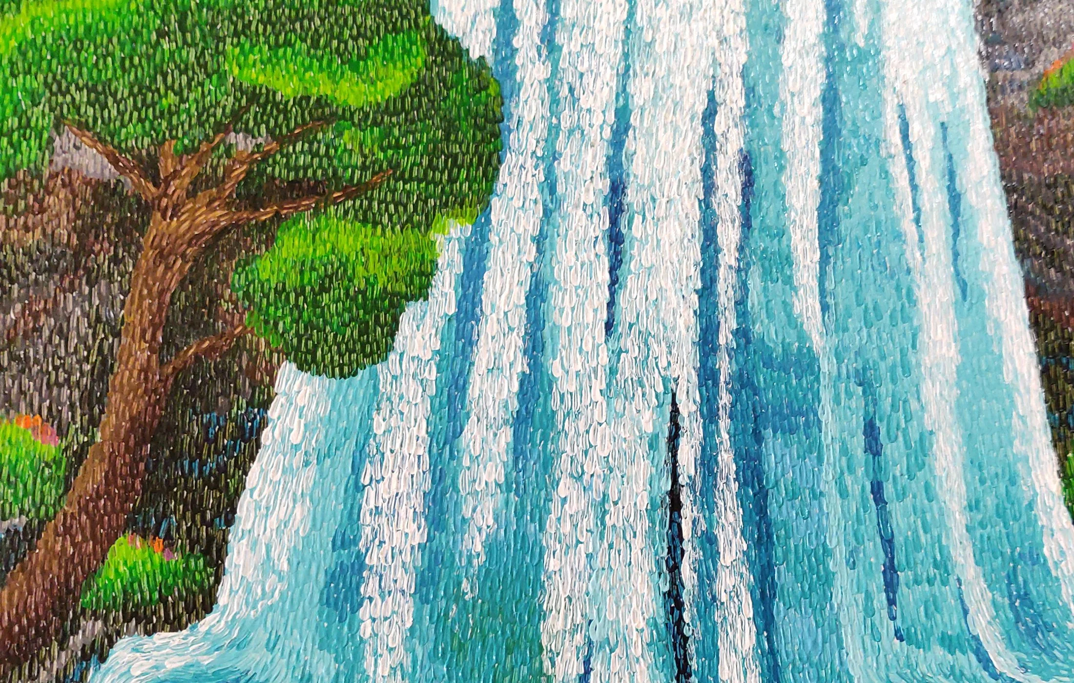 Each and every drop of the water, every leaf in the tree is painted individually with the help of a unique painting nib.