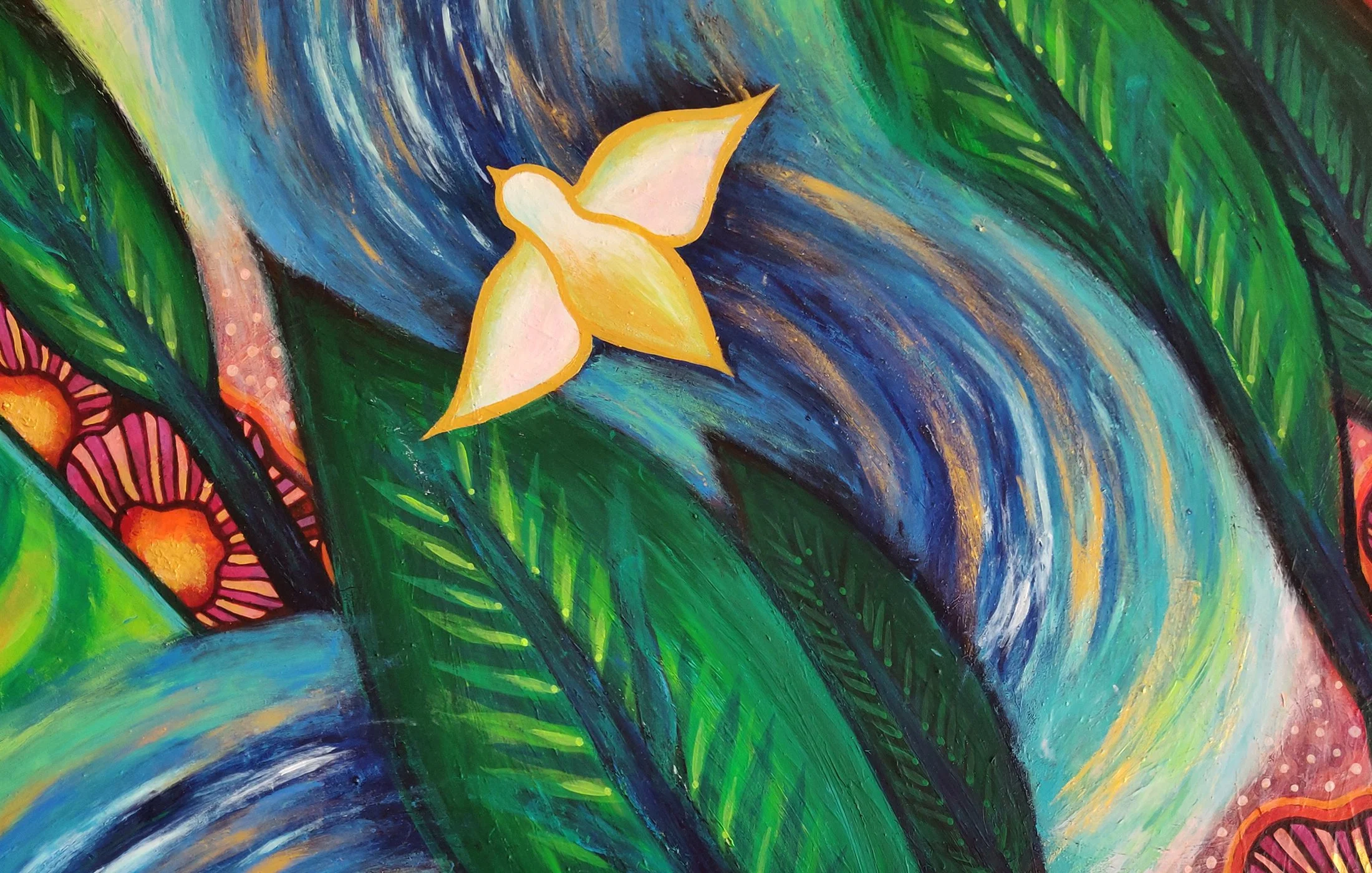 In this bright nature painting, I have tried to merge two perspectives - A bird's eye view and a human eye-level view. A metaphor for accepting a fact that, everyone has their own point of view towards things happening around them and it can be totally different from each other. Everybody can try to have a free mind like these golden birds to understand others without judgment. So we can hope to live in harmony with understanding people.