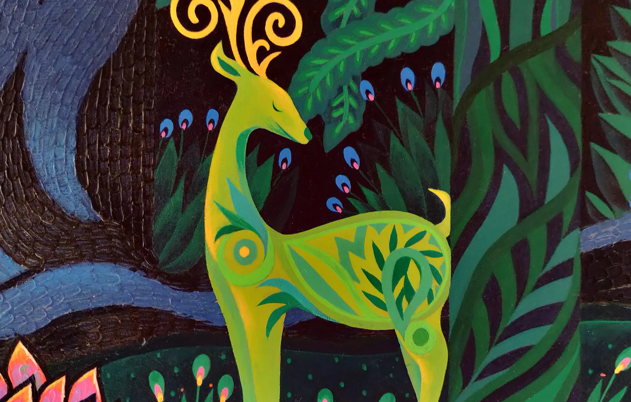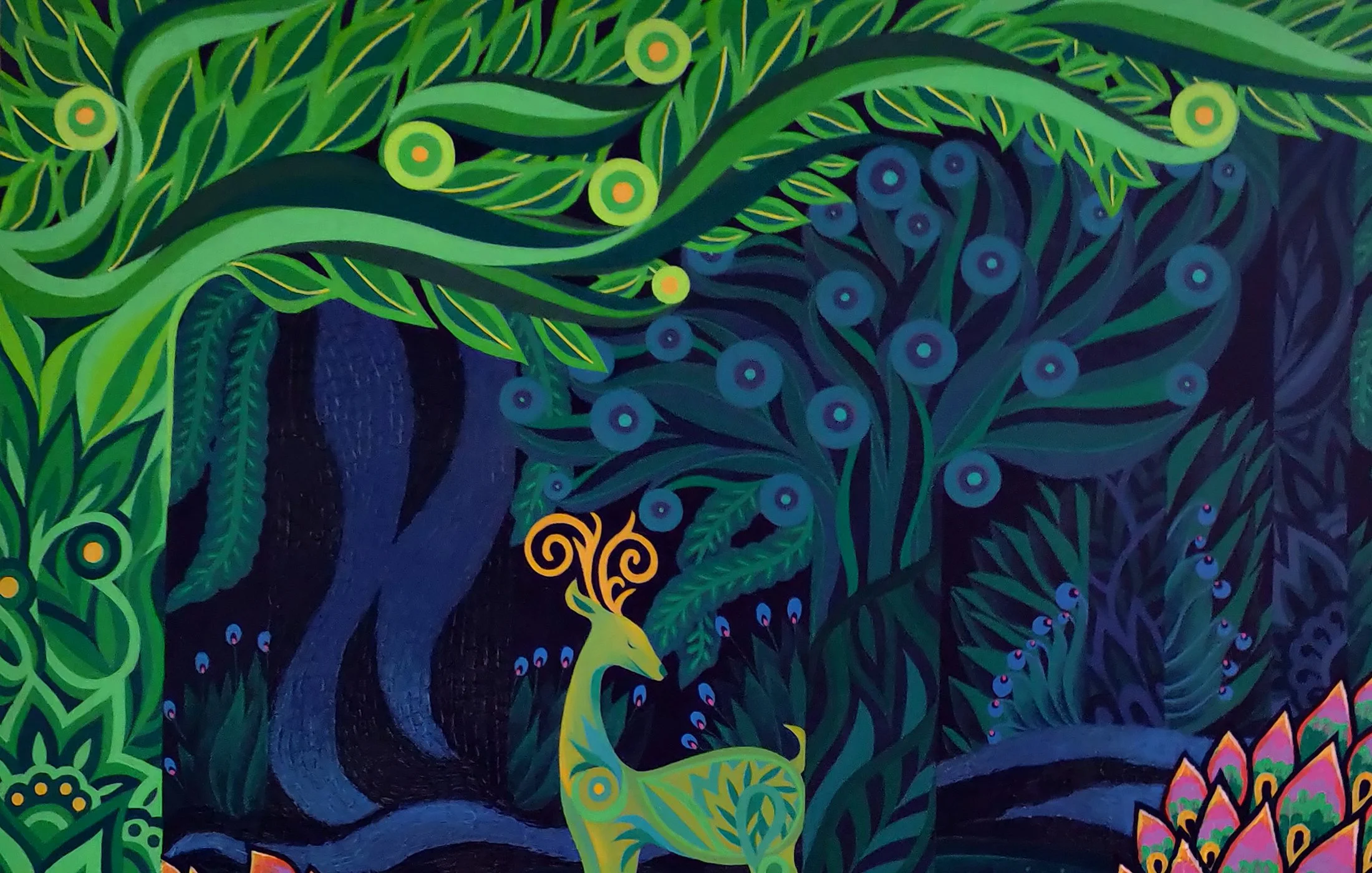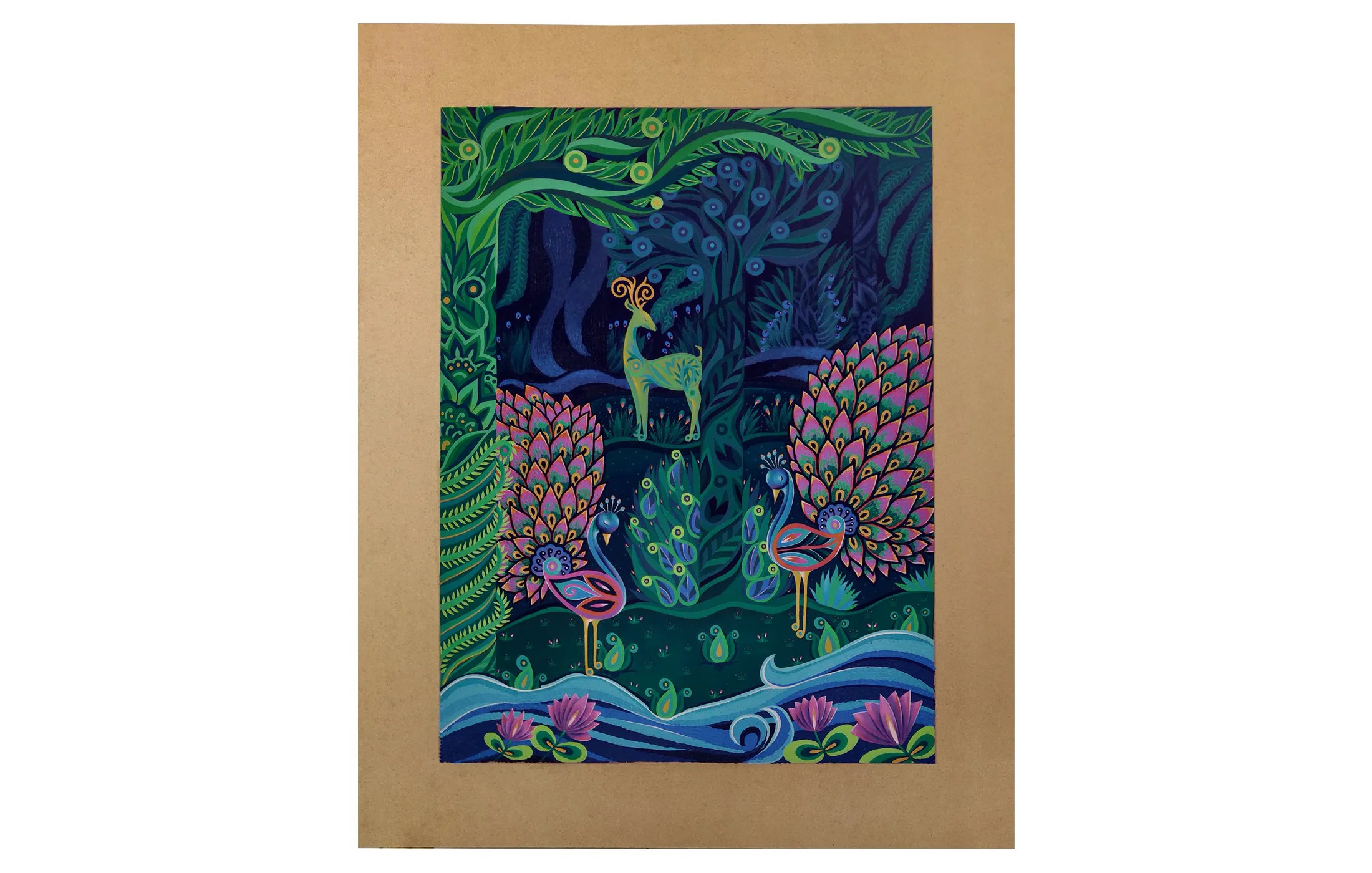 As a kid I have read many stories about forests and beautiful creatures in it. Elegant deers, magnificent peacocks, the healing sound of waterfalls and the big old trees which makes the forests enchanting and intriguing. This painting is inspired from those childhood memories. When I look back now, I have realised how our lifestyle is damaging this beautiful earth day by day and soon there will be no more forest stories for next generations to tell. So lets remember the paradise once earth was and as humans, let’s continue to help the earth, so our children will revel and get inspired by forest stories. Where they too can experience the awe and magnificence of forests.