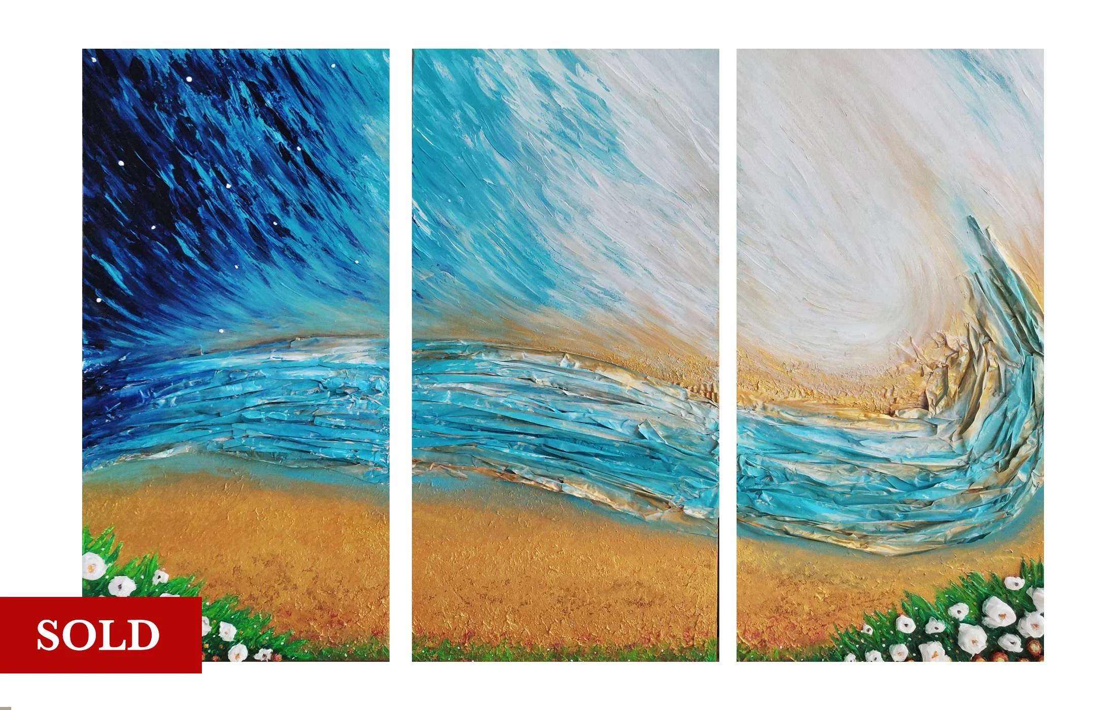 A customised art piece created for someone’s living room. A beautiful abstract sea landscape with fresh blue waves and golden beach. The client wanted a good texture in the painting. Keeping that in mind, waves were created with waste packaging papers. The flowers were created with tissue papers and golden colour for the beach was used with special texture paint. This was a set of 3 paintings displayed next to each other.